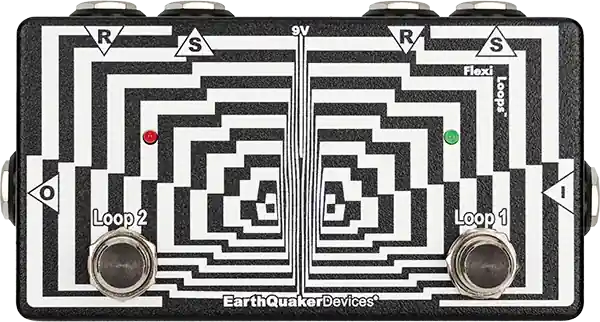 The Flexi Loops from EarthQuaker Devices is a dual effects loop utilizing our renowned Flexi-Switch® technology, a silent relay switch with true bypass that allows simultaneous switching between momentary and on/off mode.Using an effects loop on your pedalboard allows you to easily remove all your effects from the signal path to maintain the integrity of your sound when not in use. Using a dual effects loop with Flexi-Switch® technology allows you to create two separate effects loops and switch them in and out in a snap!You’re not limited to using the Flexi Loops as a single effects loop! You can use one channel as a tuner/mute output or even as a simple mute switch. Use the outputs to send signals to different sources and easily select them! The Flexi Loops uses high-quality soft-touch momentary footswitches for durability and fast action, ensuring years of play. This device is completely passive and there is no circuitry in the signal path, but it will require power for the relays to pass the signal.