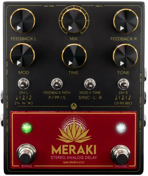 With the WALRUS AUDIO Meraki Stereo Analog Dual Delay immerse yourself in true stereo analog delay with eight MN3005 bucket brigade chips to create warm, rich repeats capable of 1200ms of delay time with parallel, ping-pong and series delay modes. Independently control the delay times and modulation of the left and right channels to create syncopated repeats or keep them locked in to the same timing for classic delay sounds.Explore parallel, ping-pong, and series delay lines to craft your unique sound. Create syncopated rhythms or classic repeats with independent control over the left and right channels. You can fine-tune the amount of repeats in each channel, from subtle echoes to full oscillation. Add depth to your repeats with adjustable modulation, creating a chorus/vibrato effect in the repeats. Secondary functions allow wave shape and modulation phase adjustments as well.Take command of your timing with the Tap Tempo switch, or use external tap or an expression pedal for even more dynamic control over time or modulation depth.Digitally manipulate controls like time, modulation, tap tempo, tap division, and more with five-pin MIDI integration. Choose between True-Bypass or Buffered Bypass for trails, and toggle between Trails (default) or Relay (no-trails) with the Bypass switch.
