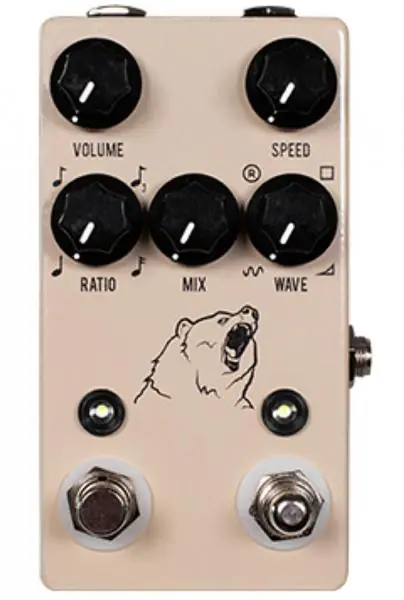 Based around classic Vox and Black Face tremolo sounds, the JHS PEDALS Kodiak Tremolo effect pedal brings vintage tremolo into the modern era with four different wave patterns, Mix, onboard tap-tempo, and four sub-divisions to give you total control as well as plenty of inspiration to bring your sound out of hibernation.Let’s take a look at all the features this brown beast bears…The Kodiak has five simple controls: Volume, Speed, Mix, Ratio, and Wave. The Volume control enables you to set the overall volume however you like it, either dialed back, at unity, or boosted.A great feature of the Kodiak is that you can turn the Mix knob all the way down and use the Volume to boost your amp or other pedals, acting as a preamp or slightly driven boost. The Speed knob is a manual control for the speed of the tremolo, which you can also set with the on-board tap-tempo switch. The Mix knob controls how deep the tremolo is perceived, from fully clean to fully wet. The Ratio control gives you the ability to dial in faster speeds that are perfectly sync’d with the BPM of your tap.You can choose from quarter notes, eighth notes, “triplets,” or sixteenth notes.The Wave control gives you four different wave variations to choose from: Sine, Rhythmic, Square, and Ramp. The Sine wave is a classic amp-like tremolo sound, the Rhythmic wave gives you an interesting rhythmic pattern that can be used in many different time-signatures for different effect, the Square wave gives you a more choppy trem sound, and the Ramp wave gives you a warbly type of sound. With all these options, sit down, grab a jar of honey, and spend lots of time with your new bear-friend to really get to know what he has to offer!The Kodiak also features a Tap/Expression jack on the right side of the pedal. Plug in an external tap tempo or an expression pedal to control the speed of the tremolo. Select either TAP or EXP via the switch on the left side of the Kodiak.