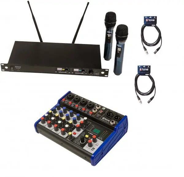 This X-tone package includes 2 wireless microphones, 1 Xmix 8dsp Mixer, and 2 Xlr Xlr 3 meter cables.The XHF 202 L is a 2-channel wireless system for singers and presenters, which offers great audio performance for any use, Karaoke, stage, rehearsals, and speech.It allows a range of 60 meters to be reached under ideal conditions, with infrared synchronization.Its transmitter has an output power of 10MW.Integrated system and noise reduction.An OLED HD display on the front panel indicating reception rate (RF) and signal level (AF)The frequency response of both microphones ranges from 50hz-16khz.Both microphones are dynamic, and cardioid.the X-tone MIX8 Dsp is an 8-channel analog mixer.Compact mixer, you can take it anywhere with you, whether you are a musician or a band, by connecting your favorite equipment:- Microphones, instruments, keyboards, guitars, smartphone.In addition, thanks to its integrated DSP, the mixer includes 16 effects, which will add to your tracks:- Reverb, delay, echo, chorus, flanger, phaser…..