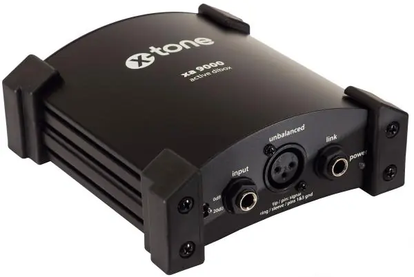 The active direct box X-TONE xa 9000 can transform an unbalanced signal into a balanced signal and adapt the impedance and levels of guitars, keyboards, amps, consoles or any other instrument source electronic, an unbalanced parallel output (Link) return the input signal to an amplifier, a switch connect or separate the input mass from the output mass, the box can be powered via phantom power (48v) or with a 9v battery (supplied). The aluminum shell and rubber feet provide protection and stability.