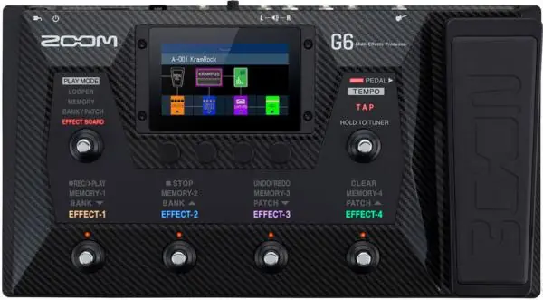 Including a looper, a drum box, an USB interface, an expression pedal, a tuner an so many other functions, the ZOOM G6 Multi-Effects Guitar Processor has no creative boundaries.The G6 delivers the ultimate collection of Zoom’s legendary guitar effects and tones, including brand new Distortion and Modulation effects.The G6 has room for 240 patches, including 100 presets so you can build patches for each song in your repertoire and easily cycle through your setlist. Create patches of up to seven effects.Your sounds may be complex but building them shouldn’t be. With easy-to-use application driven technology, the G6’s 4.3-inch color touchscreen lets you drag, drop and swipe your way to new sounds.All the best amps in amp history are in here (and a few new ones, too), along with 70 pre-loaded, precisely recorded impulse responses (IR) and room to add more than 100 of your own.The four Play Modes on the G6 will change the touchscreen and footswitch layout to give you quick access to the controls you need.Use the Looper to add layers to your sound. Create loops up to 2 hours using an SD/SDXC card. The G6 can create multiple loops up to 2 hours each in length with an SD/SDXC card.* Create, store and recall up to 256 loop files (*45-second looper without SD card).Choose your groove from the 68 onboard rhythm patterns, styles and time signatures.The G6 has a mono input, stereo outputs with volume control, a mono fx loop, aux in, control in and headphone out. Using the USB port, the G6 also functions as a 2in/2out audio interface for Mac and PC.With a USB connection, Guitar Lab software allows you to browse and upload/download an endless assortment of amps, effects and artists patches. Guitar Lab is available for both PC and Mac.